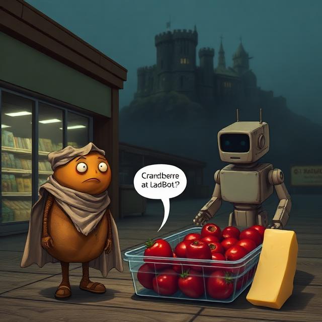 - Article Excerpt (Intro): Sadspud and SadBot enter therapy hoping for emotional clarity and instead encounter weaponized puns, existential discomfort, and a recommendation to visit Castle Droughmoore—a place apparently run by witches, vampires, and highly organized sentient food. Fleeing the session, they are intercepted outside a grocery store by a disturbingly well-informed cranberry who confirms that, yes, things can get worse—and will.
